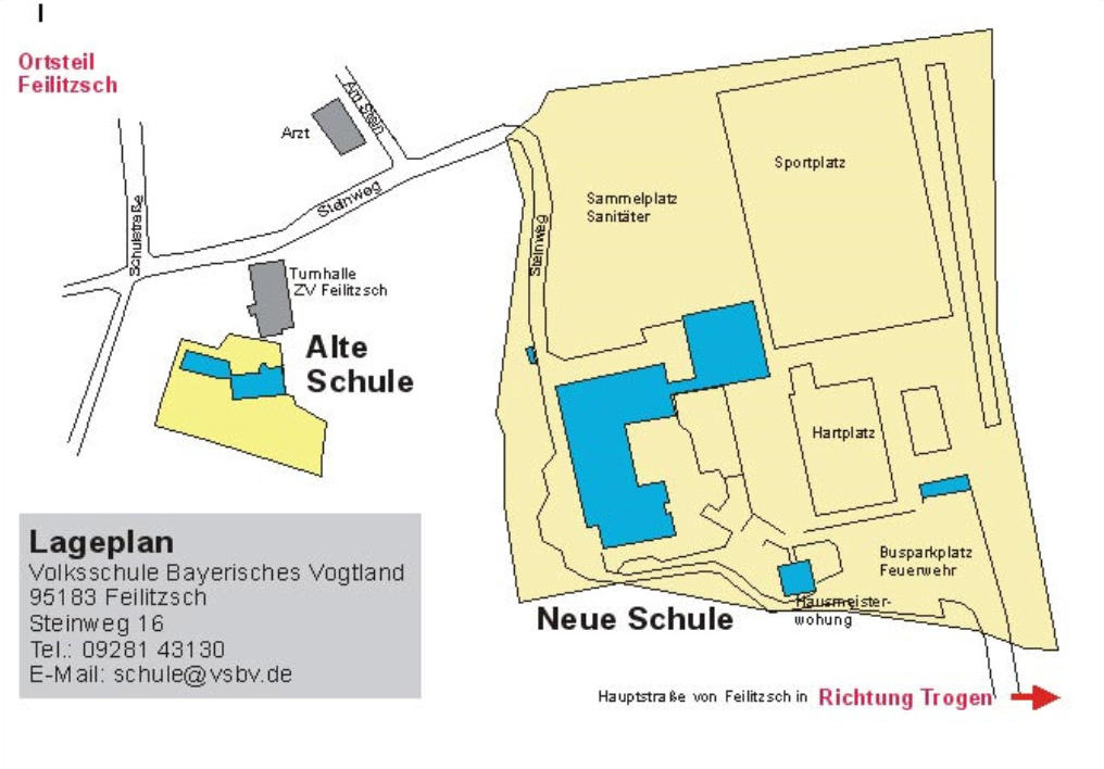 - Außensportanlagen (Hartplatz, Fußballplatz, Laufbahn, Weitsprung- und Kugelstoßanlage)